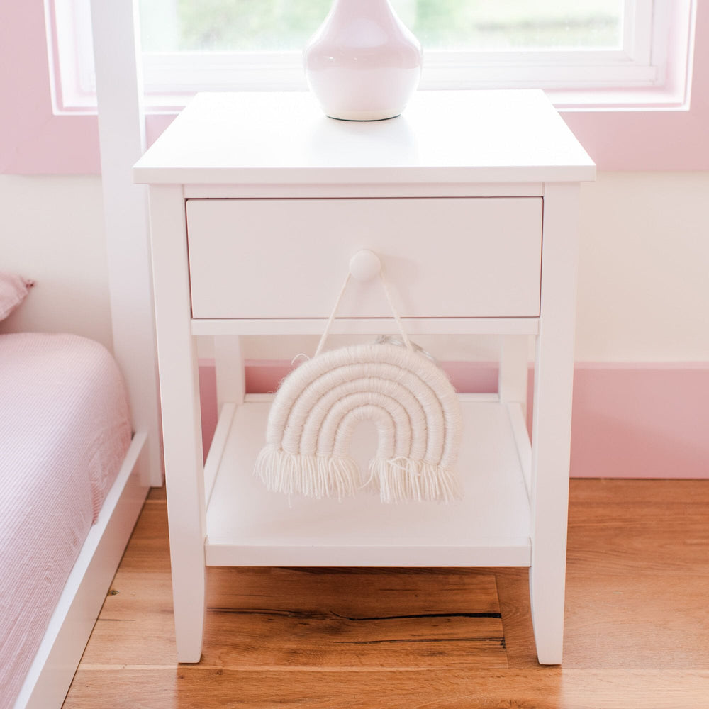 White Kids Nightstand – Solid Wood Bedside Table with Drawer & Open Shelf, Low VOC Finish